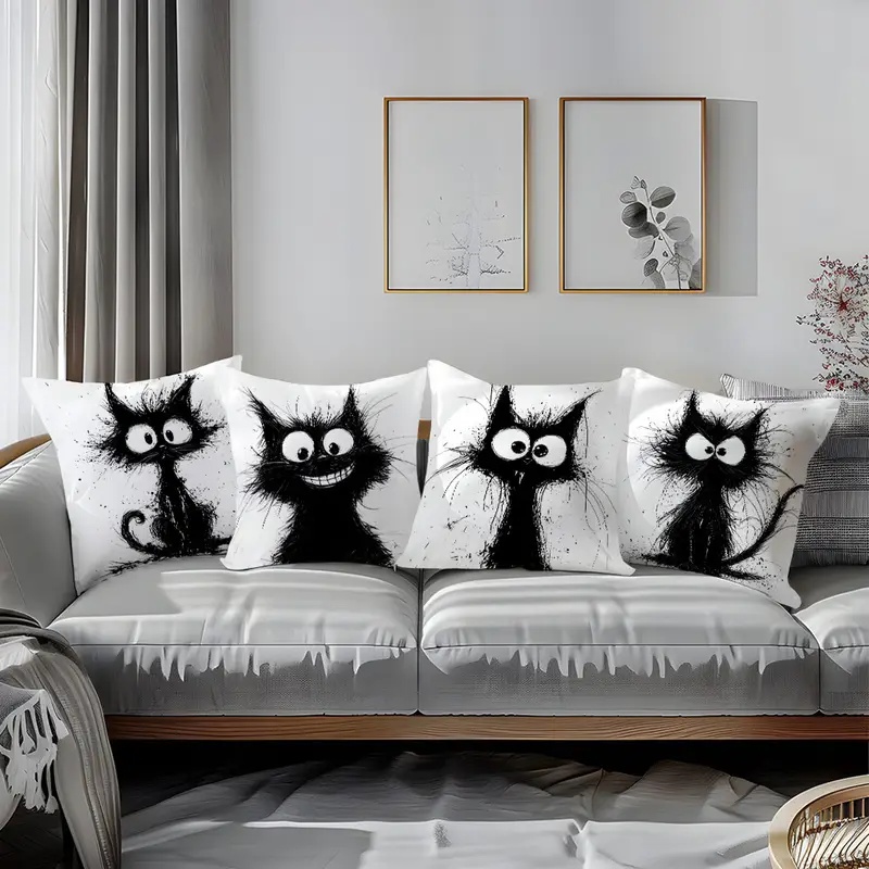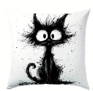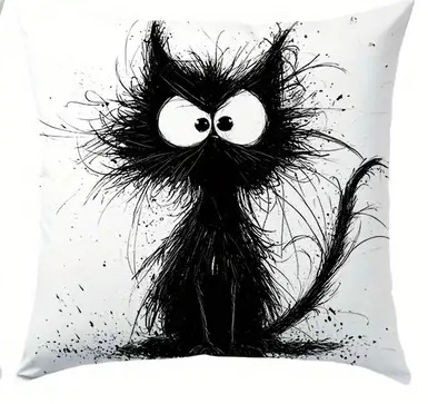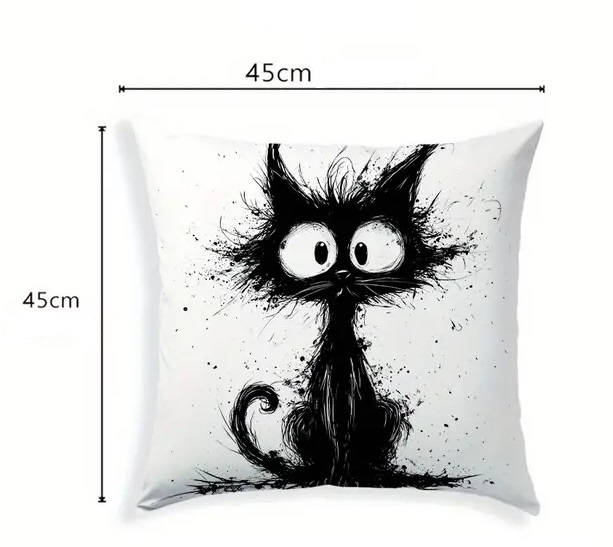 Povlak na polštář s abstraktní kreslenou černou kočkou,